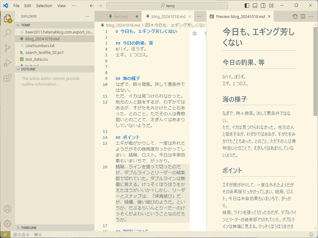 拡張機能により、Markdown文書の作成とプレビューも同時にできるとのことで試しましたが、なかなかいい使い勝手です。