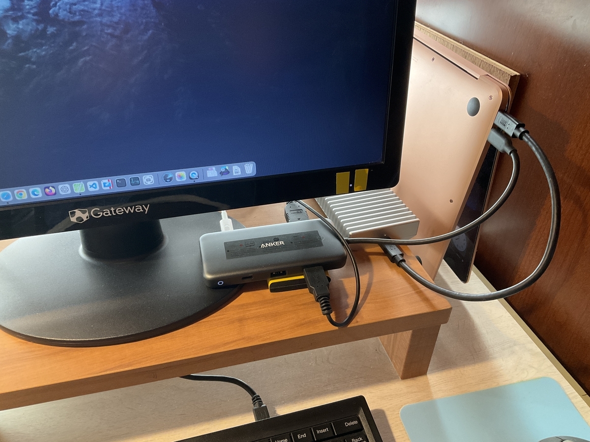 Macbook Air M1(初代)はご覧の通り。この設置方法については、私は勝手に「逆V字スタイル」と命名している。(^^;